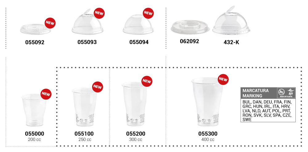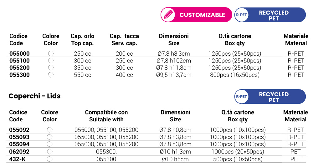 Realizzati in R-PET per ridurre l'impatto ambientale senza rinunciare alla trasparenza, si distinguono per la forma moderna ed ergonomica con un diametro più stretto alla base che si allarga verso l’alto.