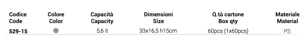 Realizzata in PS nella versatile colorazione grigia, si distingue per la sua notevole capienza: grazie a un volume di 5,6 litri e un'altezza di 15cm, permette di esporre e gestire agevolmente anche le produzioni più importanti.